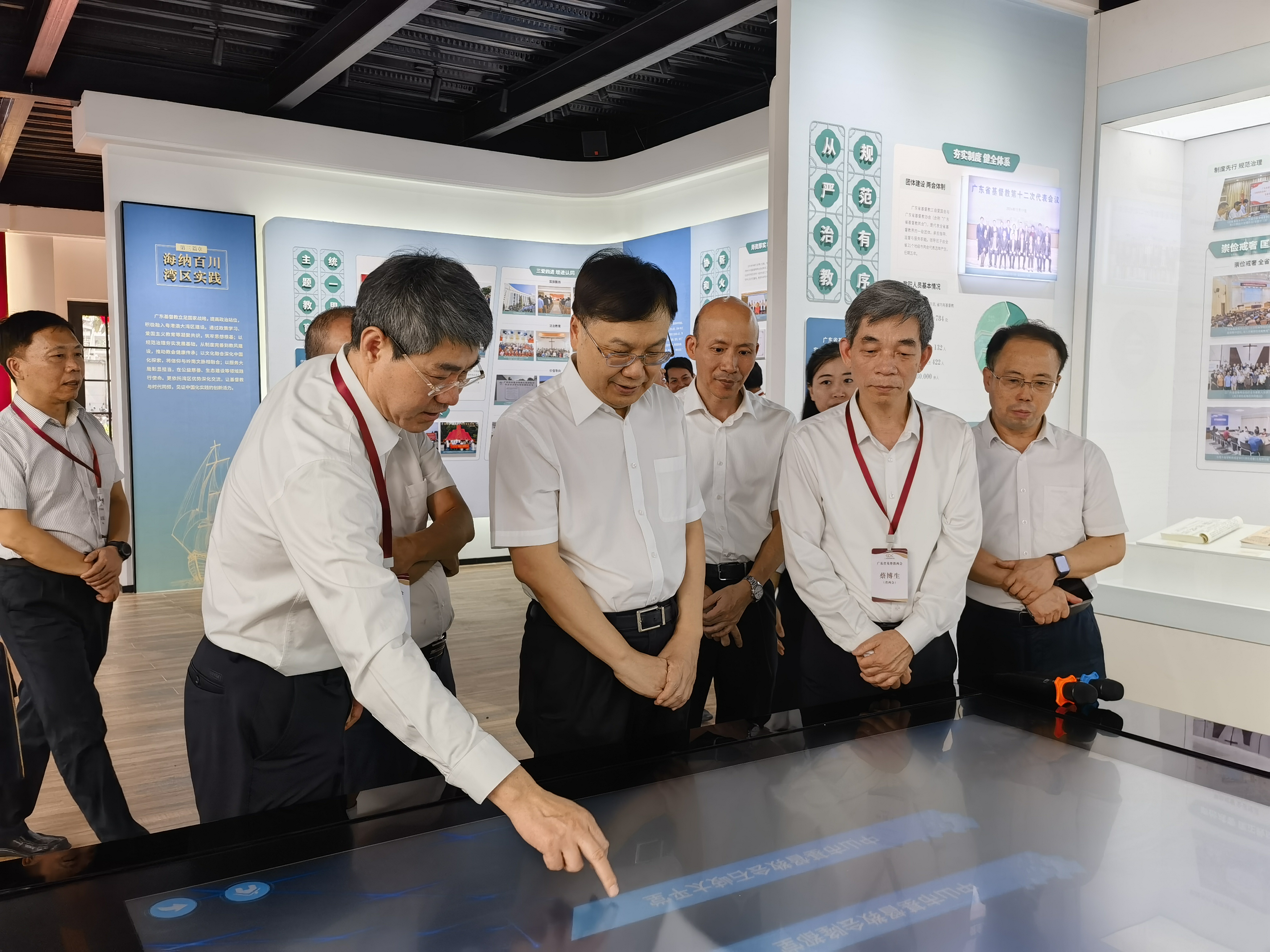 与会领导嘉宾共同为展厅揭幕。随后,全体人员一同参观展厅。展厅通过图文、实物展品与多媒体展示等多元形式,融合声光影等技术,以“政治引领·举旗定向”“文化初遇·岭南扎根”“海纳百川·湾区实践”“扬帆起航·共筑未来”四个篇章,集中展示了广东省基督教在强化政治引领、人才培养、从严治教、神学建设、社会服务等方面的实践历程与主要成果。