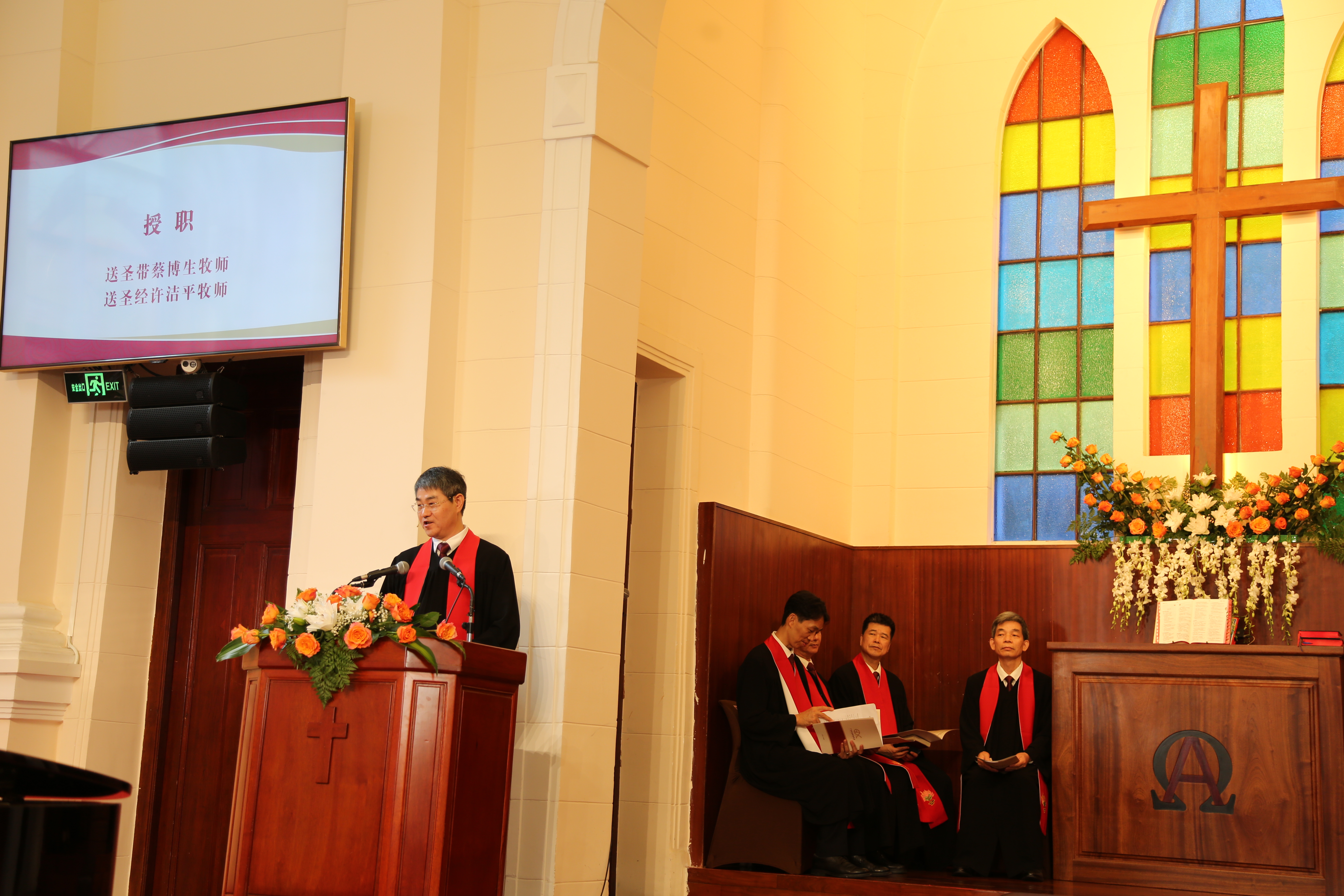 按立圣职典礼由郭云牧师主持并作宣告、询问和祈祷,谢旭广牧师引荐,蔡博生牧师授圣带,许洁平牧师送圣经,樊宏恩牧师训勉。新按立圣职人员代表朱振强牧师作答词、叶桃飞牧师祝福。