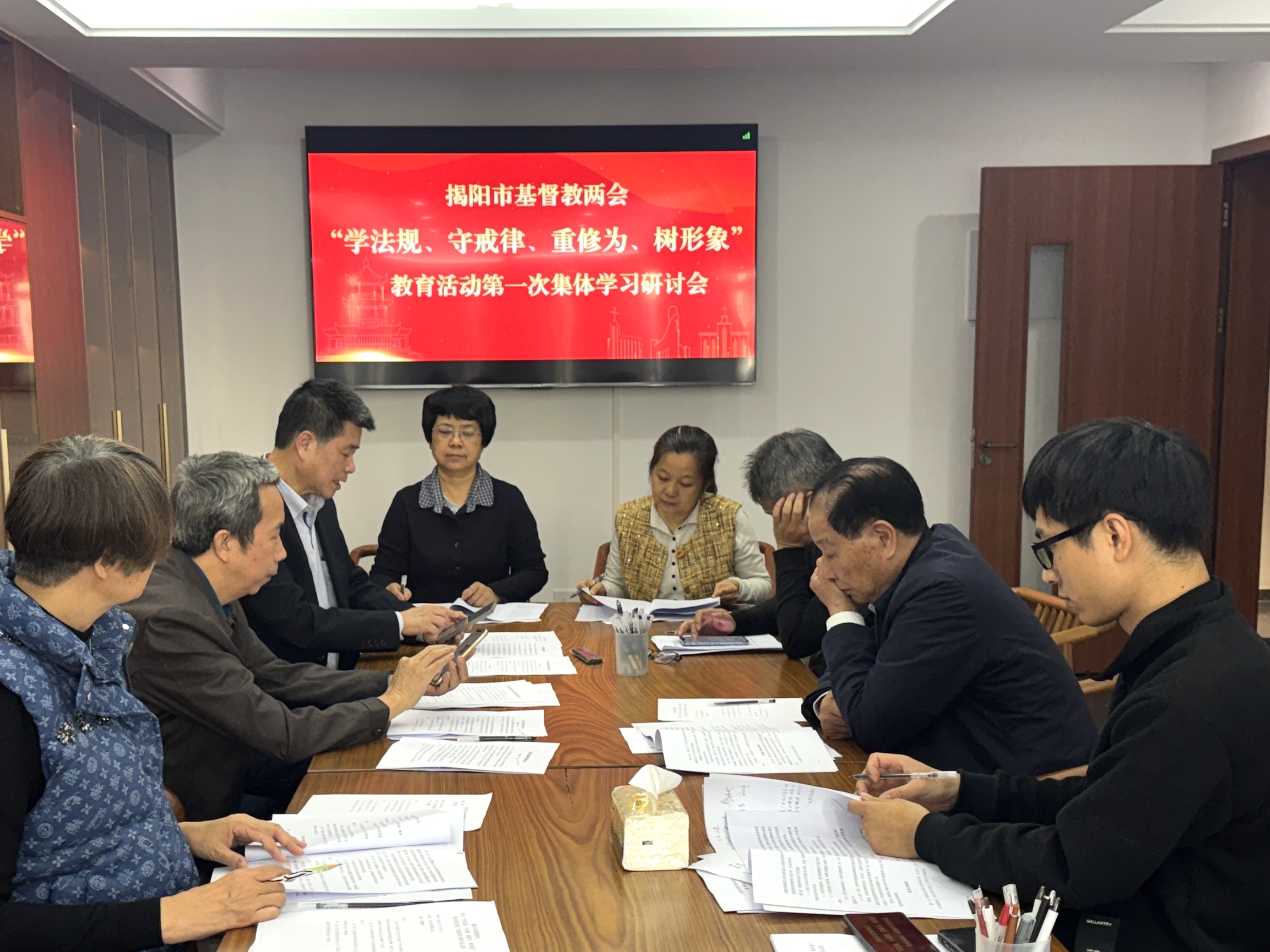12月20日,揭阳市基督教两会组织召开“学法规、守戒律、重修为、树形象”教育活动第一次集体学习研讨会,传达近期中央和我省重要会议精神,学习相关宗教法规。市民族宗局有关负责人到会指导,市基督教两会班子成员、办公室相关人员参会。市基督教协会会长许洁平牧师及蔡悦欢牧师、林晓兵牧师分别领学,并结合工作实际进行问题查摆,交流学习体会和贯彻落实意见。(通讯员 林惠纯)