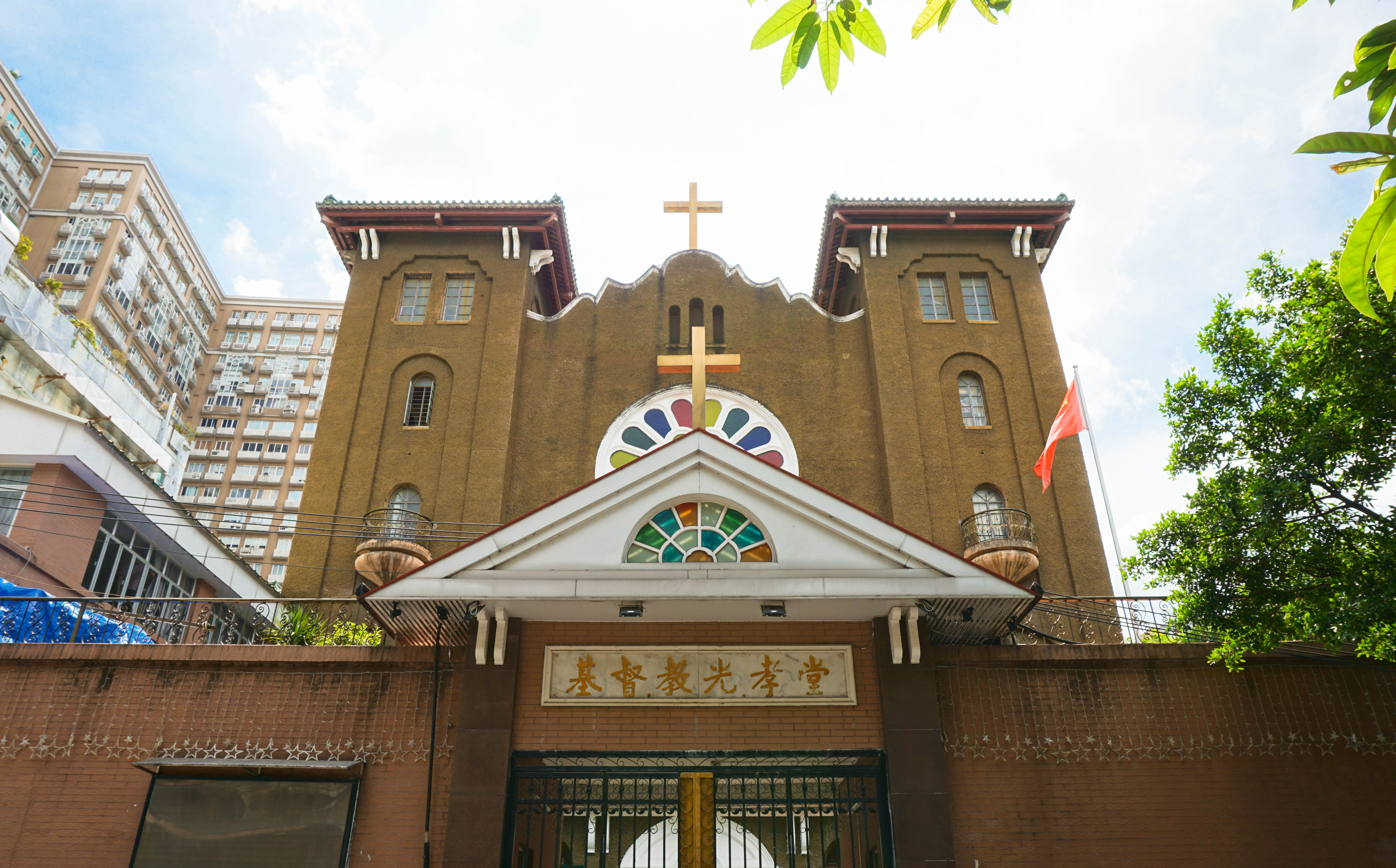 光孝堂始建于1921年,由华人基督徒自资兴建,至今已逾百年历史。教堂坐西朝东,楼高五层,外观仿若巴黎圣母院。正立面上方镶嵌大型玫瑰花窗,与屋顶十字架交相光映。南北两侧为塔形钟楼,塔顶以岭南绿琉璃瓦顶、四角飞檐装饰。整座教堂庄严肃穆、古朴典雅,2009年被列为“广州市文物保护单位”,2024年被评为首批“广州市绿美宗教活动场所”。