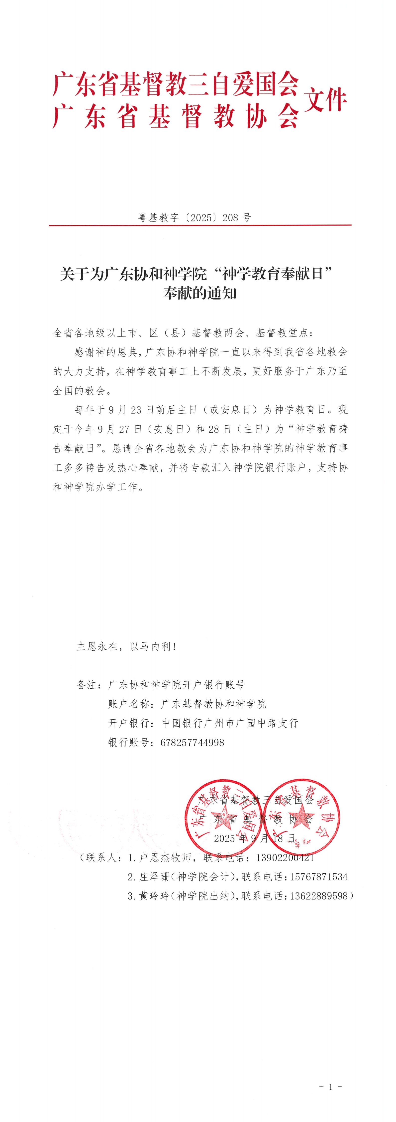 每年于9月23日前后主日(或安息日)为神学教育日。现定于今年9月27日(安息日)和28日(主日)为“神学教育祷告奉献日”。恳请全省各地教会为广东协和神学院的神学教育事工多多祷告及热心奉献,并将专款汇入神学院银行账户,支持协和神学院办学工作。