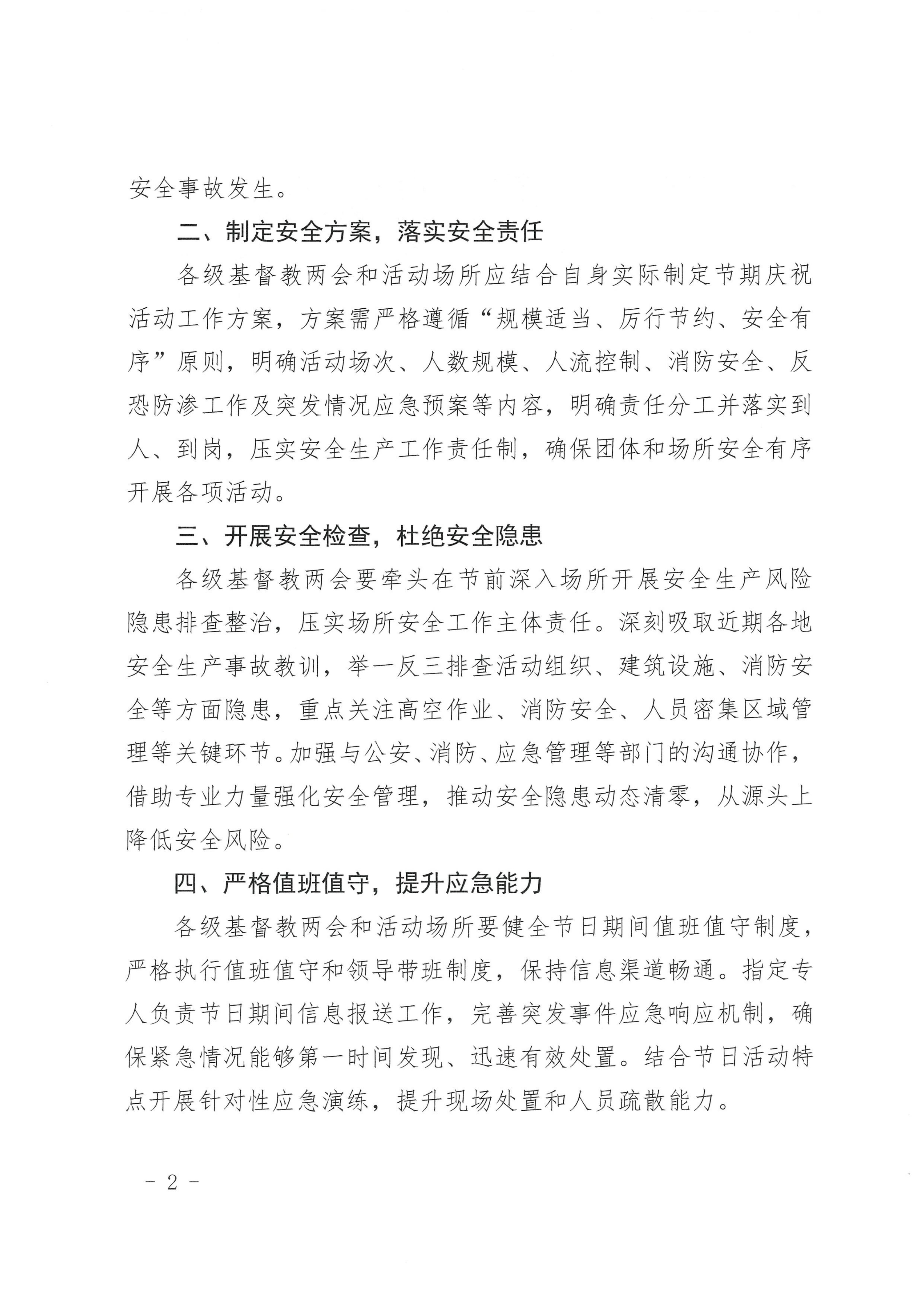 各级基督教两会和活动场所应结合自身实际制定节期庆祝活动工作方案,方案需严格遵循“规模适当、厉行节约、安全有序”原则,明确活动场次、人数规模、人流控制、消防安全、反恐防渗工作及突发情况应急预案等内容,明确责任分工并落实到人、到岗,压实安全生产工作责任制,确保团体和场所安全有序开展各项活动。