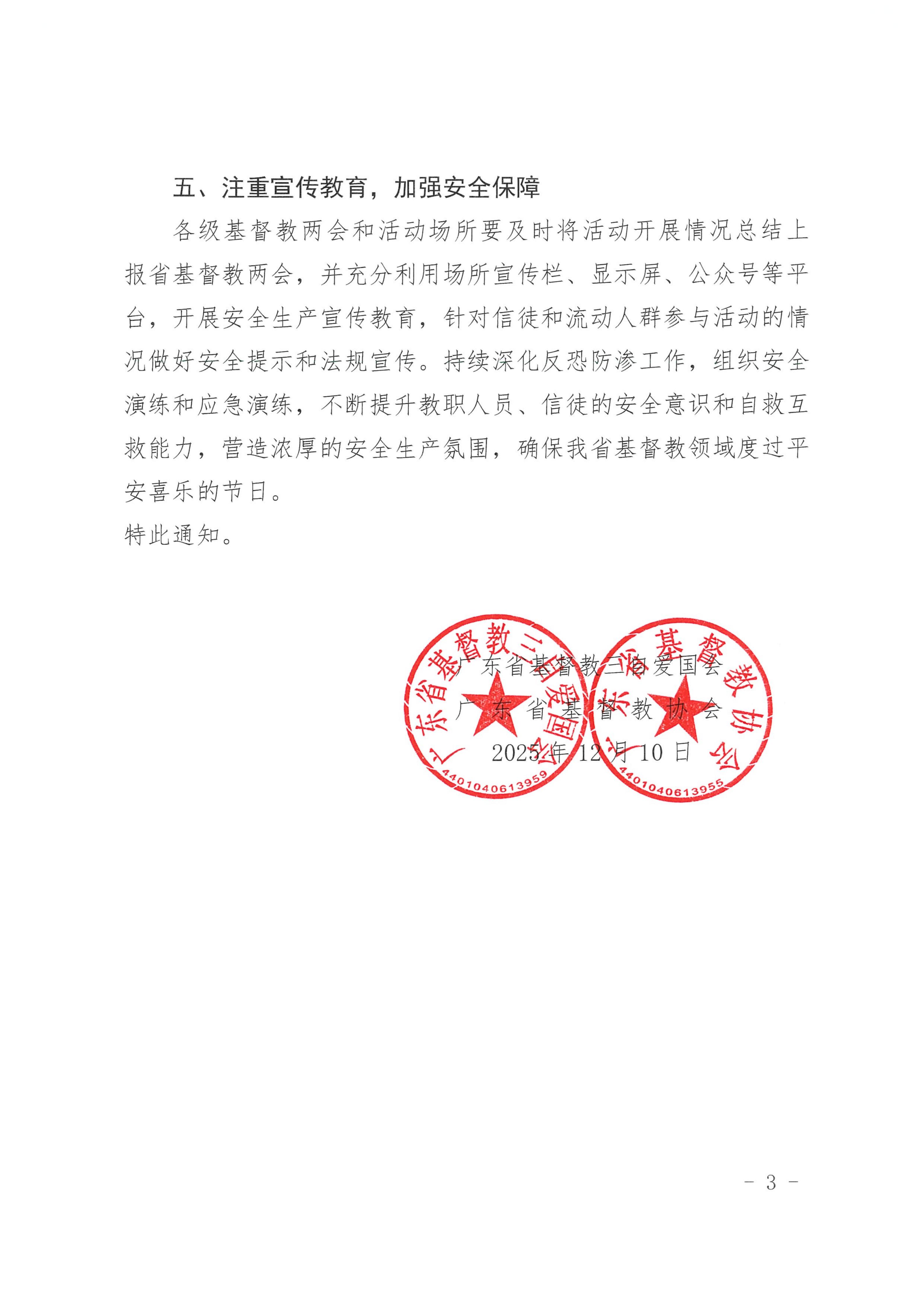 各级基督教两会和活动场所要及时将活动开展情况总结上报省基督教两会,并充分利用场所宣传栏、显示屏、公众号等平台,开展安全生产宣传教育,针对信徒和流动人群参与活动的情况做好安全提示和法规宣传。持续深化反恐防渗工作,组织安全演练和应急演练,不断提升教职人员、信徒的安全意识和自救互救能力,营造浓厚的安全生产氛围,确保我省基督教领域度过平安喜乐的节日。