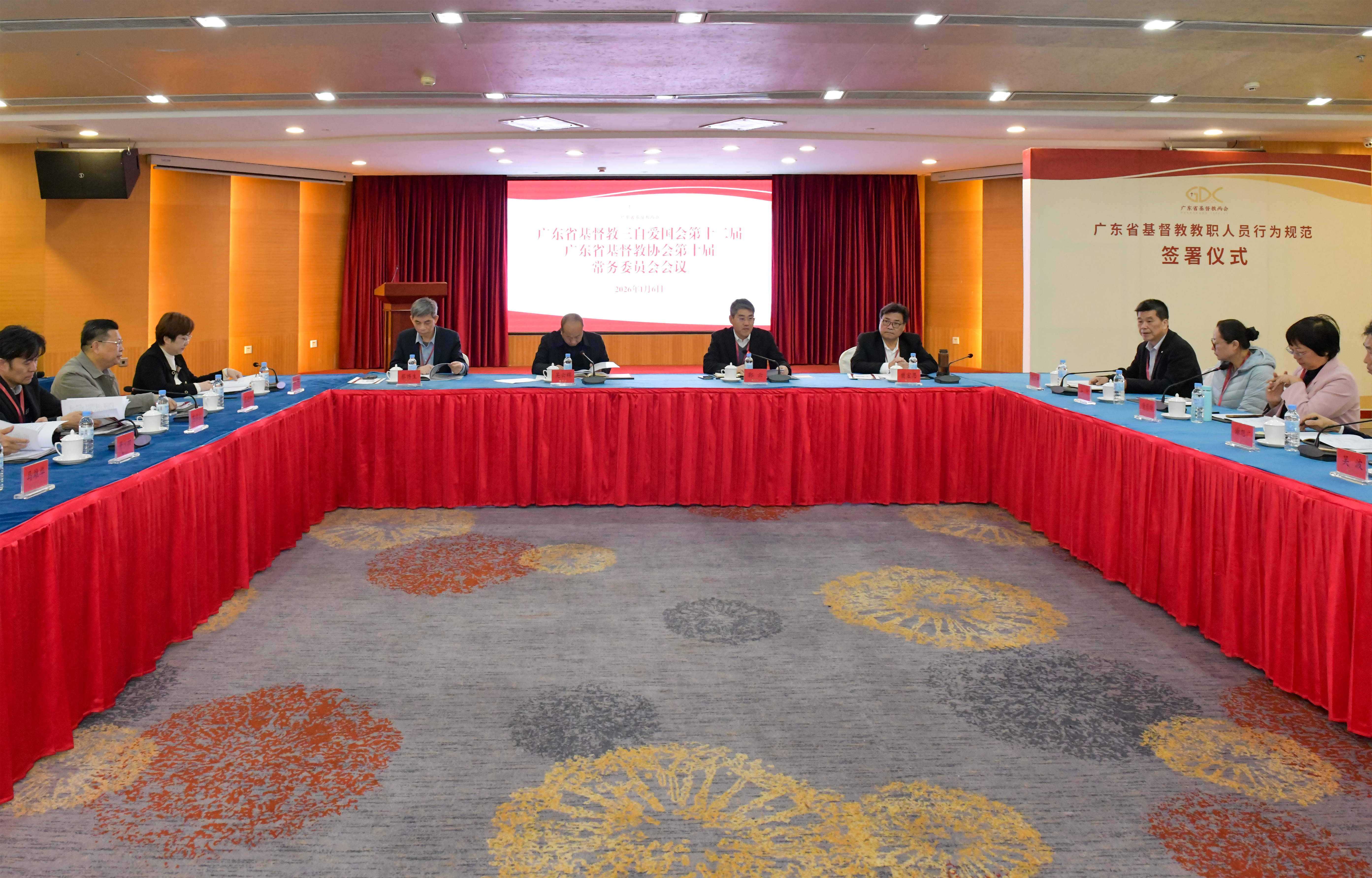 广东省基督教两会常务委员会会议审议并通过《广东省基督教两会2025年工作总结及2026年工作计划》《广东协和神学院2025年工作总结及2026年计划》,通报了“学法规、守戒律、重修为、树形象”教育活动1-6月份重点工作安排,审议并通过《广东省基督教教职人员基本行为规范》并举行签署仪式。会议指出,2025年,省基督教两会围绕基督教中国化、全面从严治教、人才培养、社会服务等重点工作取得扎实成效,荣获“广东省民族团结进步模范集体”称号。2026年,省两会将聚焦思想政治引领、深化从严治教、拓展中国化实践、优化人才培养、提升社会服务效能、扩大对外交流等方面持续发力,推动各项工作再上新台阶。会议审议通过的《广东省基督教教职人员行为规范》,从坚持爱国爱教、依法办教、修身立德、服务社会等方面对教职人员提出明确要求,为加强教风建设、树立良好形象提供了制度保障和行为指南。省民族宗教委宗教工作二处负责人到会指导,解读“学法规、守戒律、重修为、树形象”教育活动相关文件,对省基督教两会2025年工作成效予以肯定,强调2026年工作要坚持稳中求进、问题导向、思想引领,不断推动广东基督教事业健康有序发展。