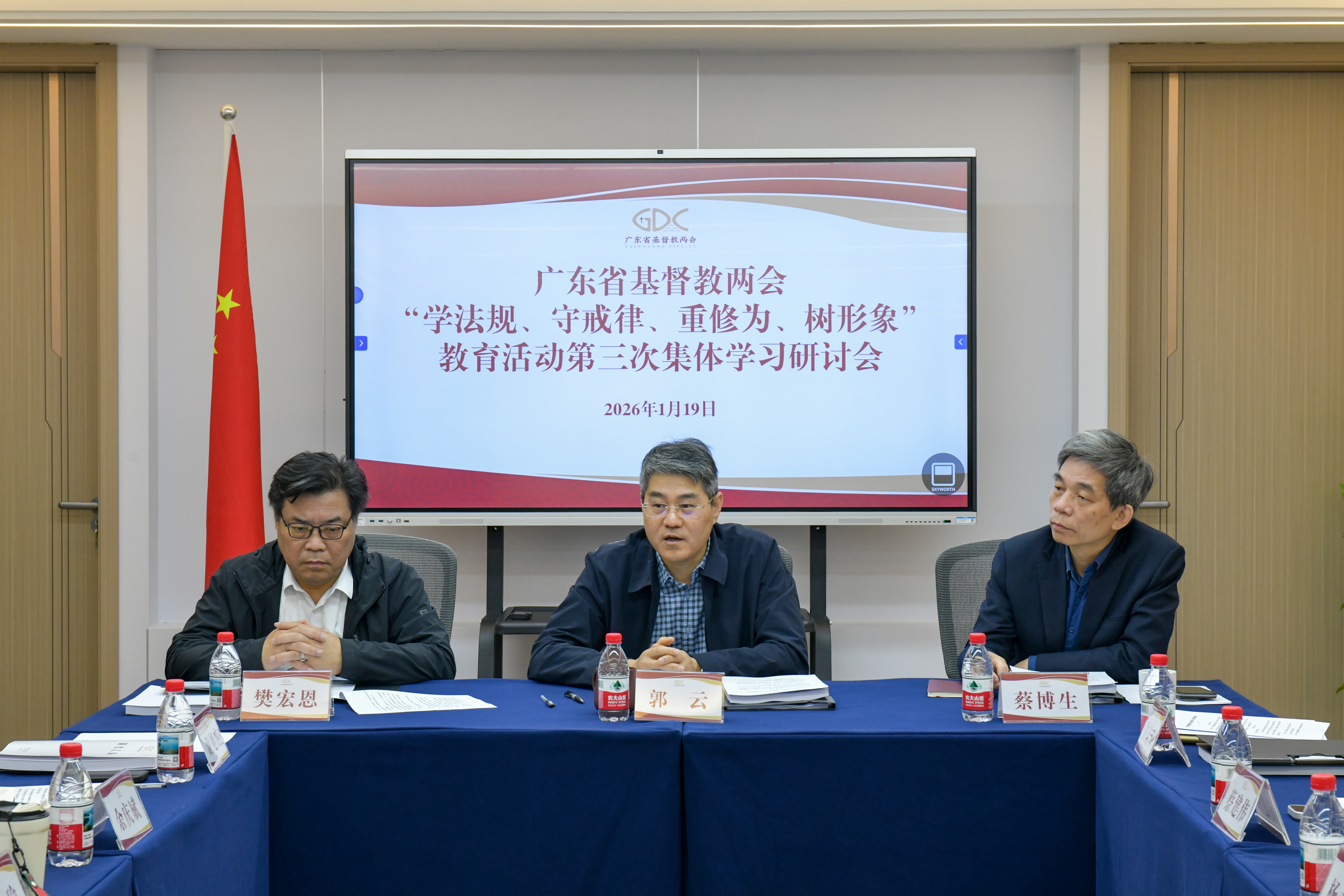 1月19日,广东省基督教两会在广州组织召开“学法规、守戒律、重修为、树形象”教育活动第三次集体学习研讨会。会议由省基督教三自爱国会主席郭云牧师主持,省基督教两会驻会班子成员、办公室副主任以上人员、直属机构负责人及部门负责人、监事会监事长参加学习。