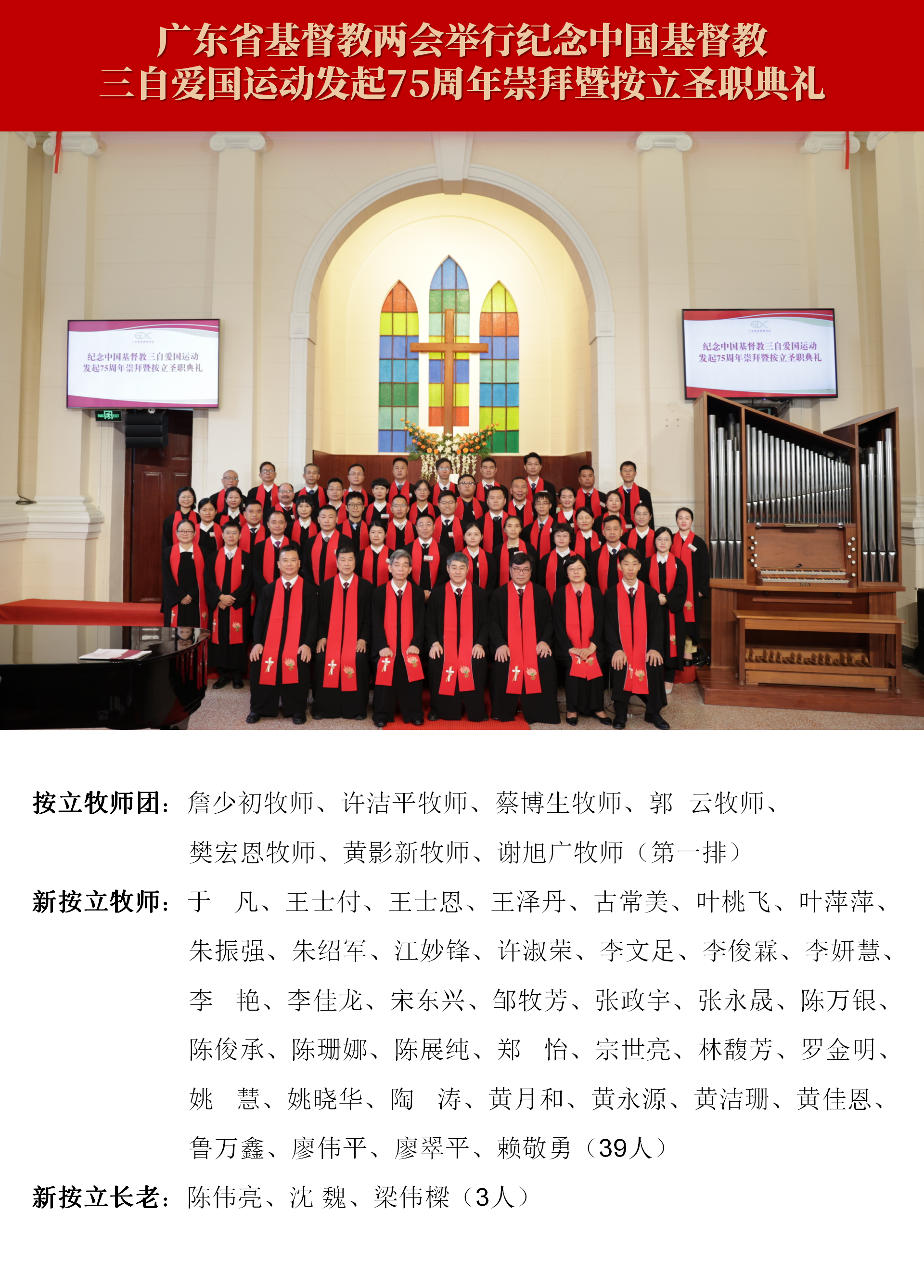 按立圣职牧师团由省基督教三自爱国会主席郭云牧师、省基督教协会会长蔡博生牧师、省基督教两会监事长樊宏恩牧师、省基督教两会常务副主席兼常务副会长许洁平牧师、省基督教两会副主席兼副会长黄影新牧师、省基督教两会副主席兼副会长詹少初牧师和省基督教三自爱国会副主席谢旭广牧师组成。