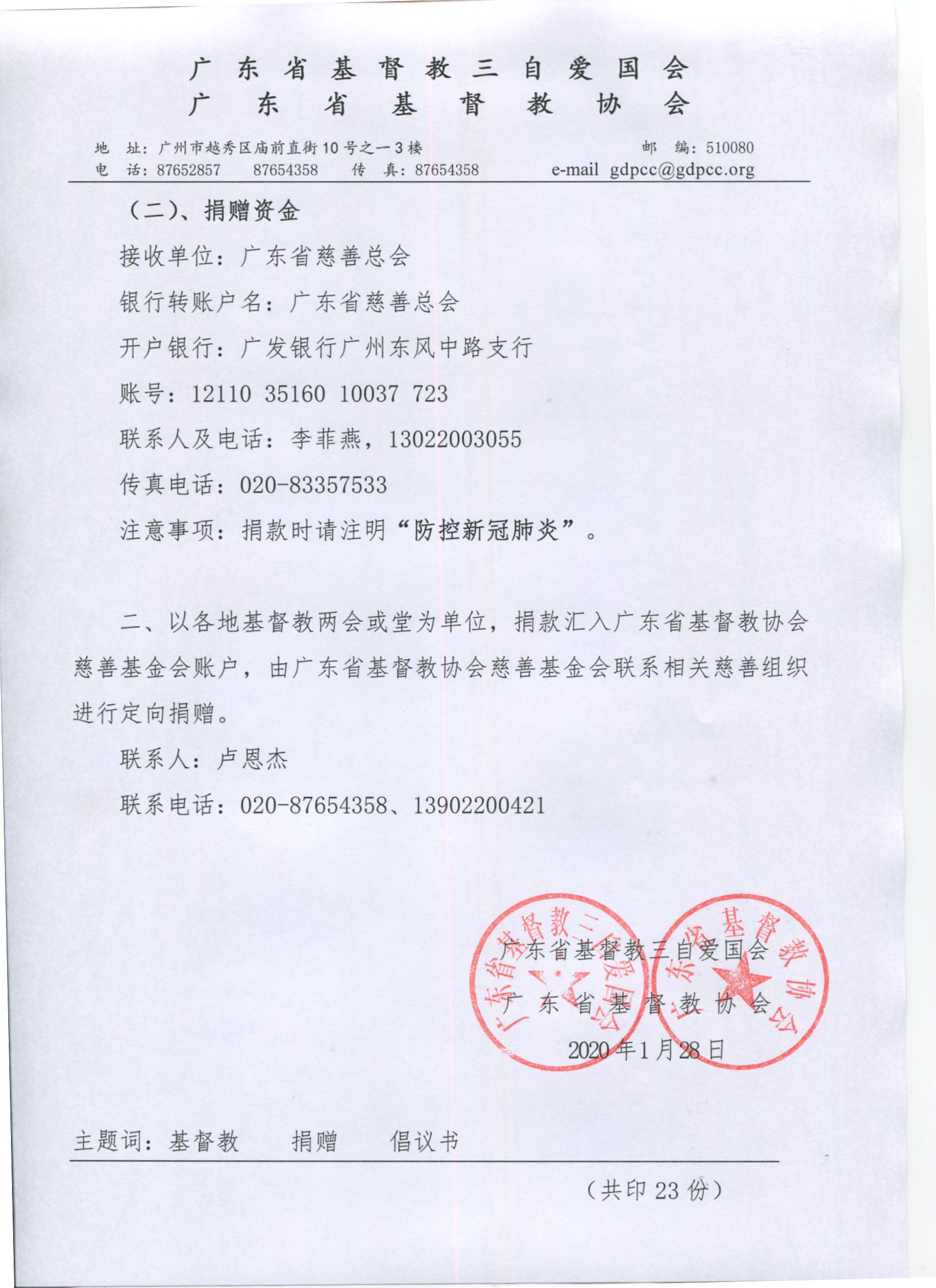 广东省基督教两会关于开展应对新型冠状病毒感染的肺炎疫情捐赠活动的倡议书