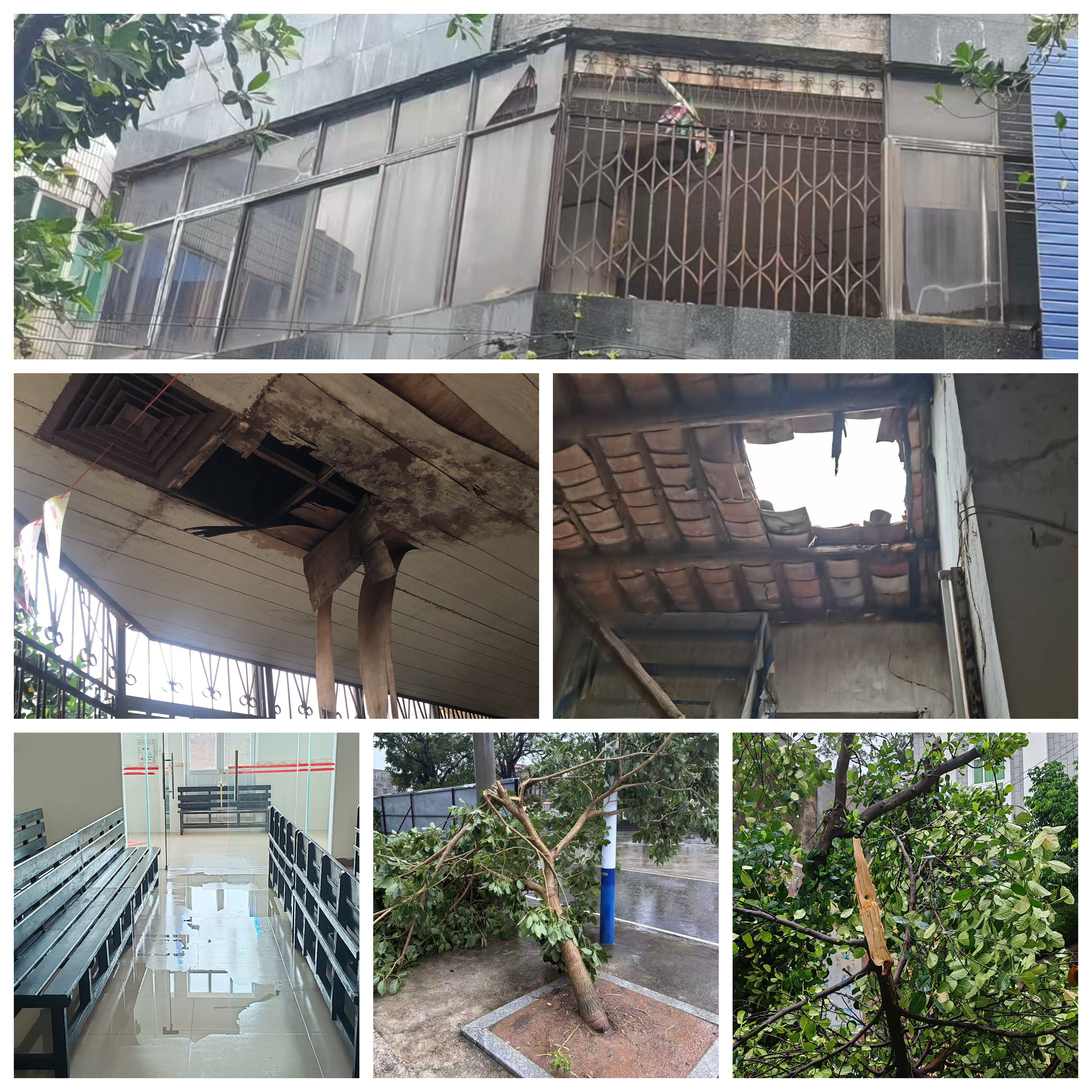 此次台风强度大,导致部分教堂建筑及设施受到不同程度损坏。个别堂点的礼拜堂及附属用房出现屋顶瓦片被掀或破损,部分窗户玻璃在强风中破裂或脱落,一些室内天花板因雨水渗漏或风压影响发生局部脱落,由于风雨强度大、持续时间长,部分场所出现室内积水现象。此外,多个场所周边环境也受到较大影响,多棵树木被强风吹倒或连根拔起,散落在庭院及通道上。