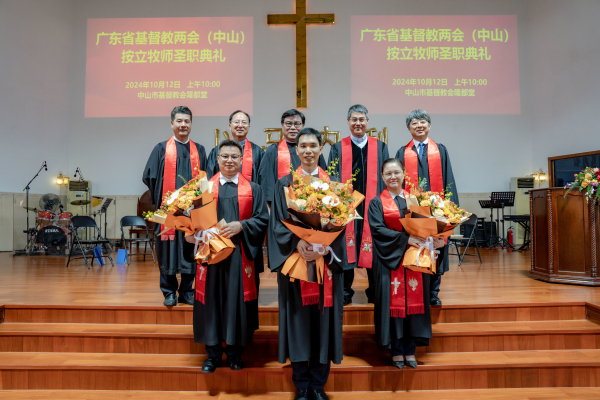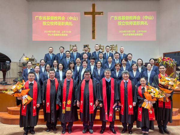 2024 年 10 月 12 日上午,广东省基督教两会在中山市基督教会隆都堂隆重举行牧师圣职按立典礼,按立郑惠(女)、郑展超、邓德干三位同工为牧师。此次圣职按立典礼不仅是对三位同工个人信仰与奉献的肯定,也为中山市基督教的发展提供了人才储备,更是对广东省基督教事工发展的有力推动。