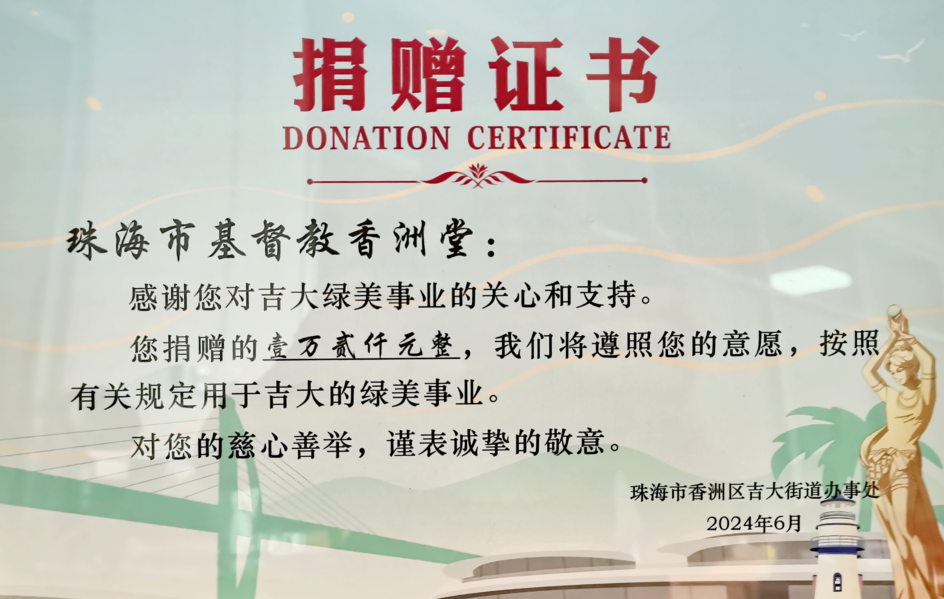 香洲区吉大街道对香洲堂的捐赠表示感谢,指出其善举助力本地生态与文化发展,为构建和谐社区、带动社会公益树立榜样。樊宏恩牧师表示,香洲堂将继续履行社会责任,积极参与公益慈善活动,助力绿美建设,为珠海高质量发展及“绿美广东”建设贡献力量。